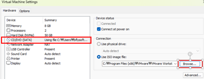 CD/DVD 선택 후 Use ISO image file을 새로 받은 ISO로 선택한다.