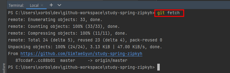 git fetch를 사용해 땡겨온다. 여기까지는 문제없다.