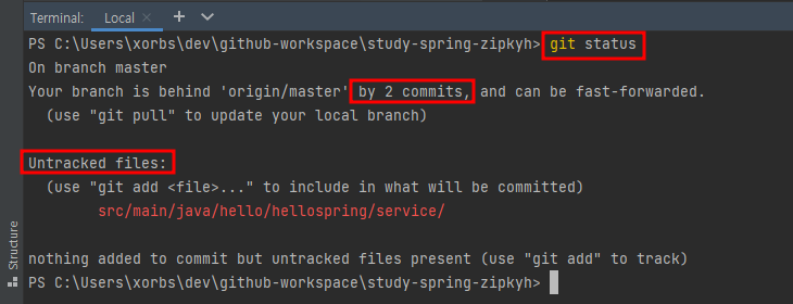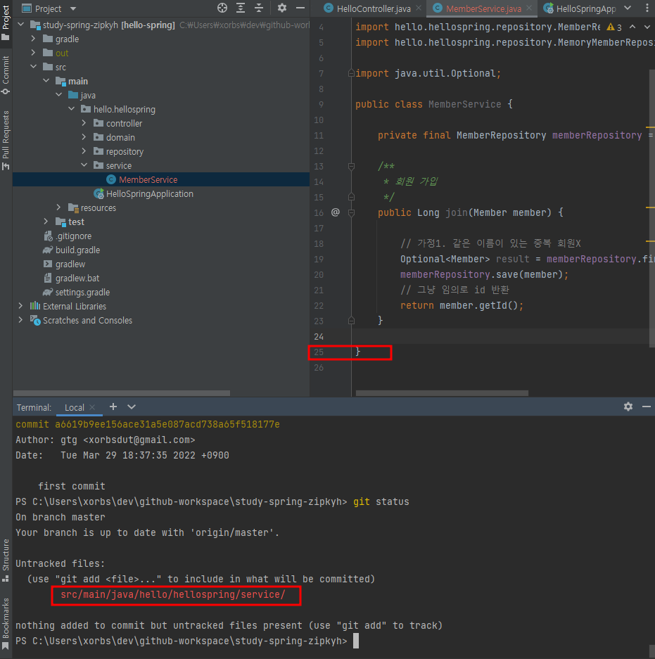 | - 집에 있는 PC에서 MemberService를 일부 수정했다. - git status로 수정한 폴더 확인 - 소스 코드 마지막 line 25 |