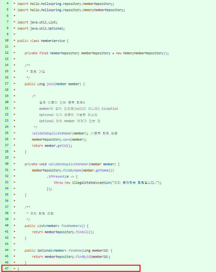 - 카페에서 노트북으로 MemberService를 작성하고 commit했다. - github에 올라간 소스 - 소스 코드 마지막 line 47 |