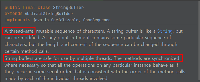 - 대부분 구현체에서 빠르므로 StringBuffer보다 우선 사용하는 것을 권장합니다.